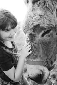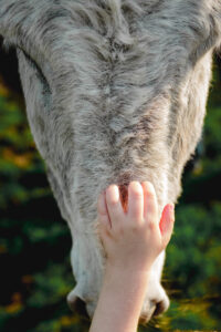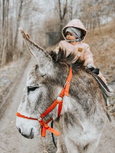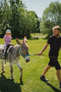 Będzie się działo. Kameralnie. Indywidualne spotkanie dziecka z osiołkiem to magia. Wybieramy jednego osiołka, z którym dziecko spędza w towarzystwie doświadczonego oślarza całą godzinę. Poznaje zwyczaje, indywidualny charakter, upodobania, budowę i fizjologię, ciekawostki i historyjki o osiołkach. Następnie przygotowujemy osła czesząc go i ubieramy w odpowiednie siodło – wybieramy się na przejażdżkę. Tak naprawdę – oprowadzankę – osiołek jest prowadzony przez przewodnika, a dziecko siedzi na grzbiecie osła i asekurowane jest przez dorosłego opiekuna. Całe spotkanie kończy się ulubioną przez wszystkich czynnością – karmieniem. Jeśli dziecko nie wykazuje gotowości bliskiego spotkania z osiołkiem spędza ten czas w towarzystwie prowadzącego i w uznanej przez siebie za bezpieczną odległości od osiołka. To równie cenny czas, kiedy dziecko może obserwować osła, słuchać o nim i stopniowo oswajać się z nową relacją.