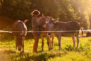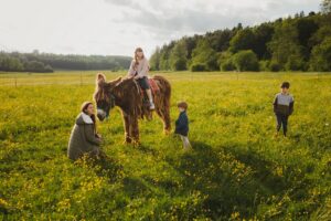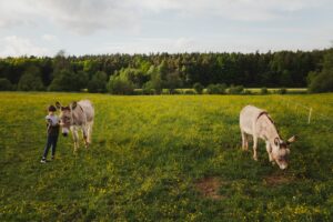 W czasie jednego spotkania możemy przywitać się z osiołkami na pastwisku i wyjść z jednym z nich na oprowadzankę.